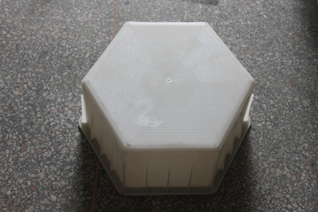 采用聚丙烯塑料原料經(jīng)注塑加工生產(chǎn)制造完成的實心六角護坡磚模具,外表白色透析,內(nèi)在堅韌耐用,是生產(chǎn)高質(zhì)量實心六角護坡磚難得的塑料模具制品。實心六角護坡磚模具整體結(jié)構(gòu)簡單,呈一個塑料盒子樣子,上面開口用于水泥澆筑,所以有不少地方也稱為實心六角護坡磚模盒。
