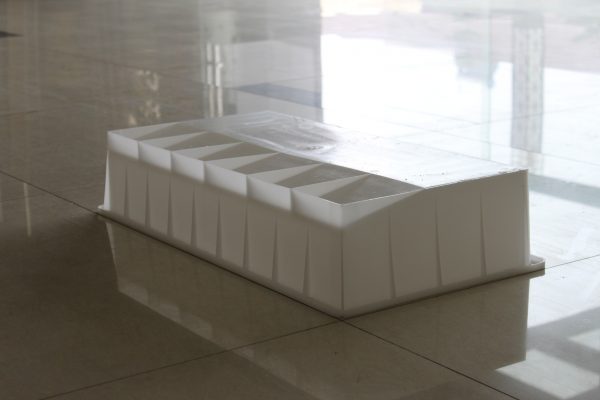 一款類似梯形結(jié)構(gòu)的公路側(cè)石模具,采用具備高度韌性的聚丙烯塑料為原料,經(jīng)大型專業(yè)注塑設(shè)備加工完成。結(jié)構(gòu)上同樣采用其他類似路側(cè)石模具的設(shè)計(jì)方案,在塑料模具底部及四周布滿加強(qiáng)筋,合理的提升此公路側(cè)石模具的耐用性。