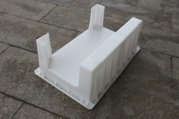 此款擋渣塊防撞型路牙石模具所用原料為聚丙烯樹脂,經(jīng)注塑機高溫熔解后在鋼模具內成型完成。乍一看似乎樣子有點奇怪,其實所澆筑水泥防撞路牙石呈L型,模具底部的兩個腳為支撐柱,方便實際擋渣塊、擋土塊的澆筑過程。為保障防撞路牙石模具的使用耐久性,更是在受力兩面增加了十六條加強筋,有效提升重復使用次數(shù),節(jié)儉生產(chǎn)成本。