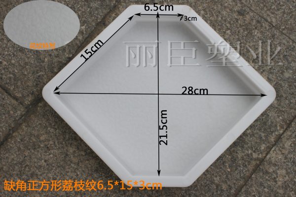 此產(chǎn)品專供西安客戶的一款彩磚模具,主要結(jié)構(gòu)以正方形缺角形狀設(shè)計(jì),其中底部為荔枝紋圖案,即所預(yù)制水泥彩磚成品表面為防滑荔枝紋圖案。此西安彩磚模具對(duì)角對(duì)稱長(zhǎng)度為28CM,缺角對(duì)稱長(zhǎng)度為21.5CM,詳細(xì)見(jiàn)下圖。