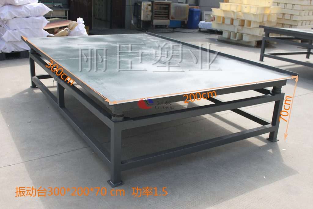 澆筑的塑料模具尺寸不同,在制作振動(dòng)臺(tái)時(shí)使用的功率也不一致。如較為大型的護(hù)欄、電纜槽塑?;蚨ㄖ频拇笮弯撃>呱?,使用在振動(dòng)臺(tái)下的振動(dòng)器的功率要有所增大。而對(duì)于小型的護(hù)坡、蓋板以及路沿石塑料模具這一塊上,使用振動(dòng)器上的公率要有所減少。除了在模具澆筑過(guò)程中可以使用外,后期模具在脫模過(guò)程中也能進(jìn)行使用,實(shí)現(xiàn)一機(jī)兩用的效果。
