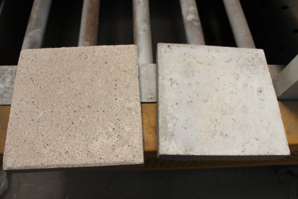 1.先使用塑料模具來(lái)澆筑成型的混凝土彩磚,對(duì)于預(yù)制成型的混凝土彩磚進(jìn)行模具的脫模,放置一旁得以備用,下面這張圖是主要能更清楚的看出使用混凝土路面拋丸機(jī)后的水泥磚表面。