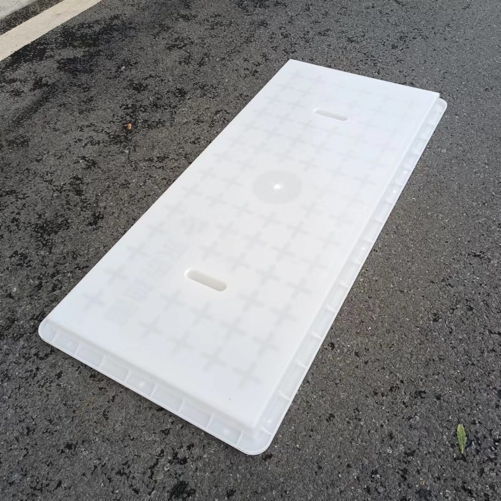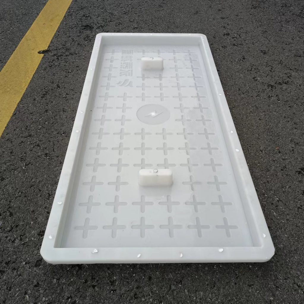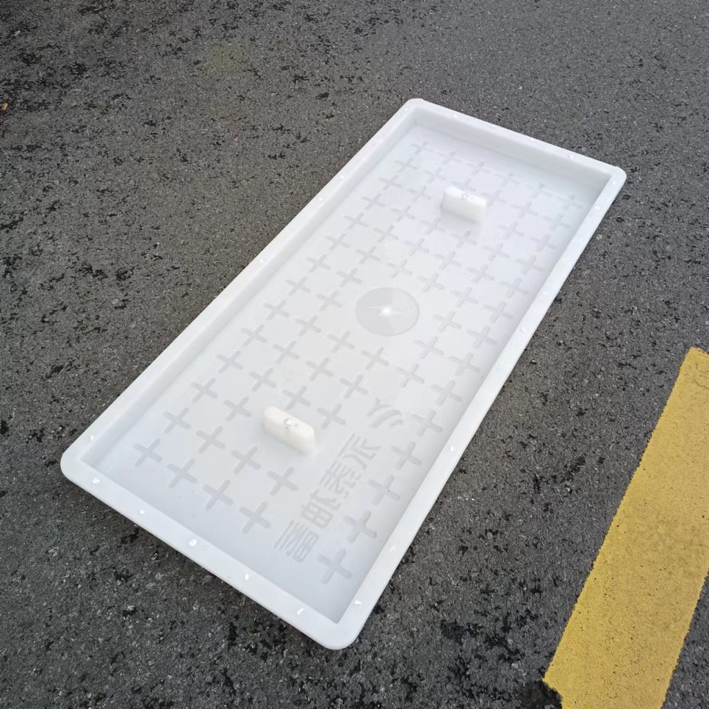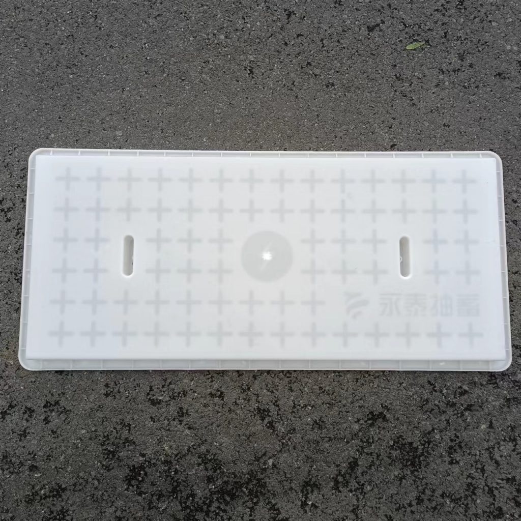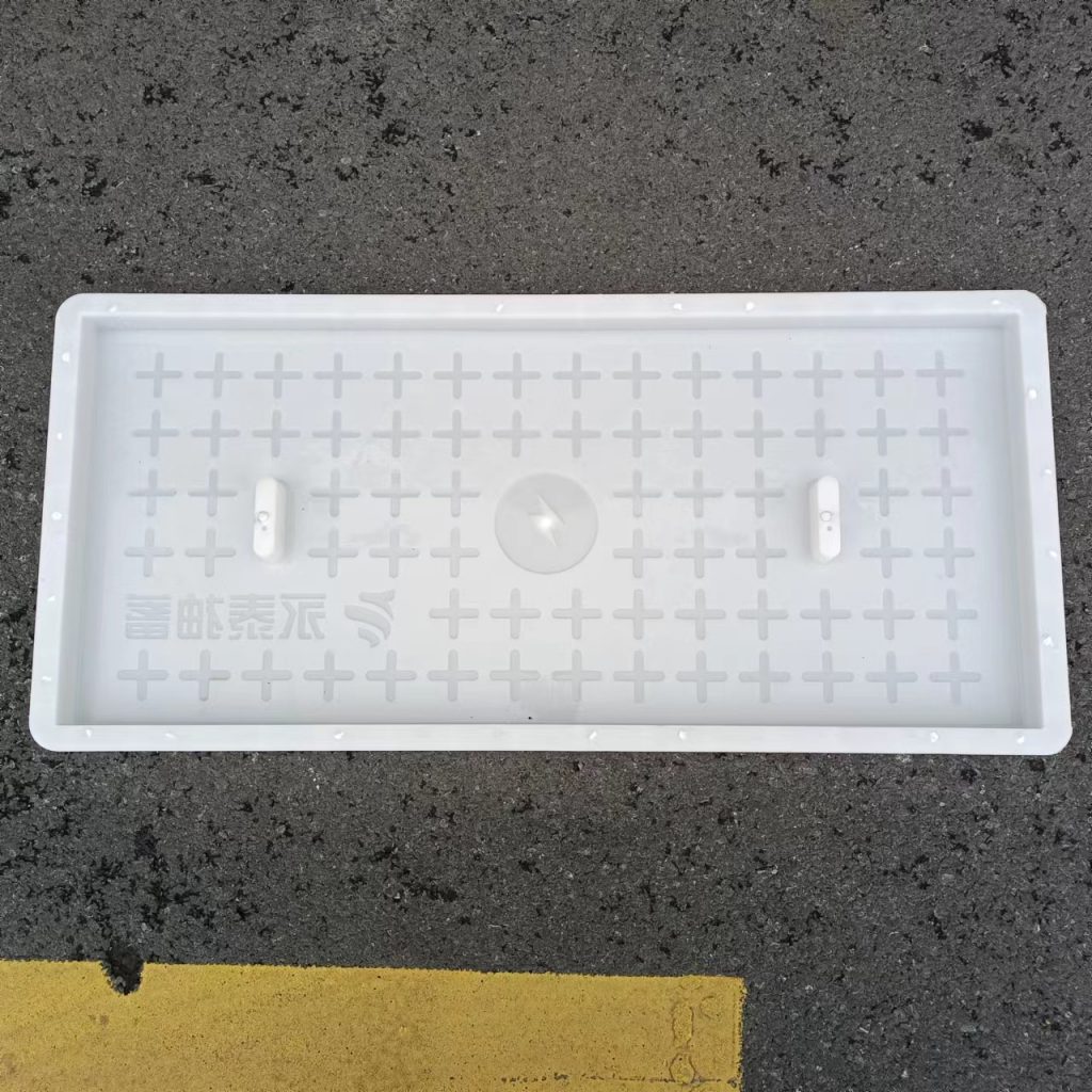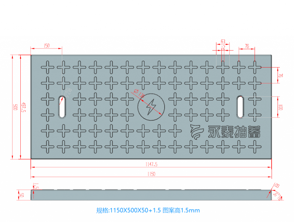 產(chǎn)品為米白色pp材質(zhì)制成,版面帶十字花紋,中心帶有電力標(biāo)志,兩側(cè)帶二孔,方便提拉,右下角帶有“永泰抽蓄”四字,為客戶定制產(chǎn)品,模具尺寸還有90cm長度,里面花紋基本一至,預(yù)制成型后電力蓋板。