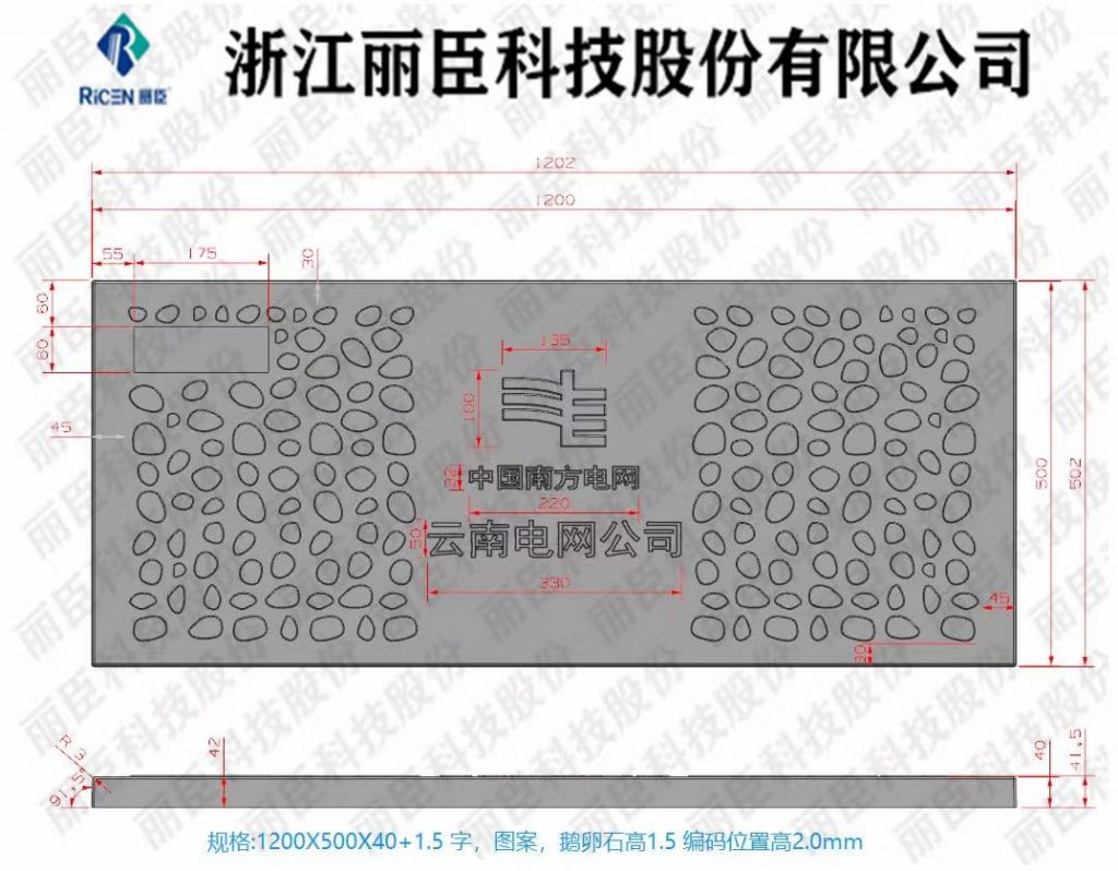 南方電網(wǎng)塑料模具、云南鵝卵石花紋電網(wǎng)模具,模具尺寸有五種款式長度分別為60、80、100、120、140,每20cm為一檔,寬度都為50cm。厚度為4cm,主要是在云南一帶使用,云南電網(wǎng)公司、該模具可包角鐵預(yù)制使用,兩邊含有小鵝卵石花紋,中間帶有南方電網(wǎng)標(biāo)志。