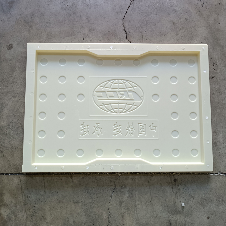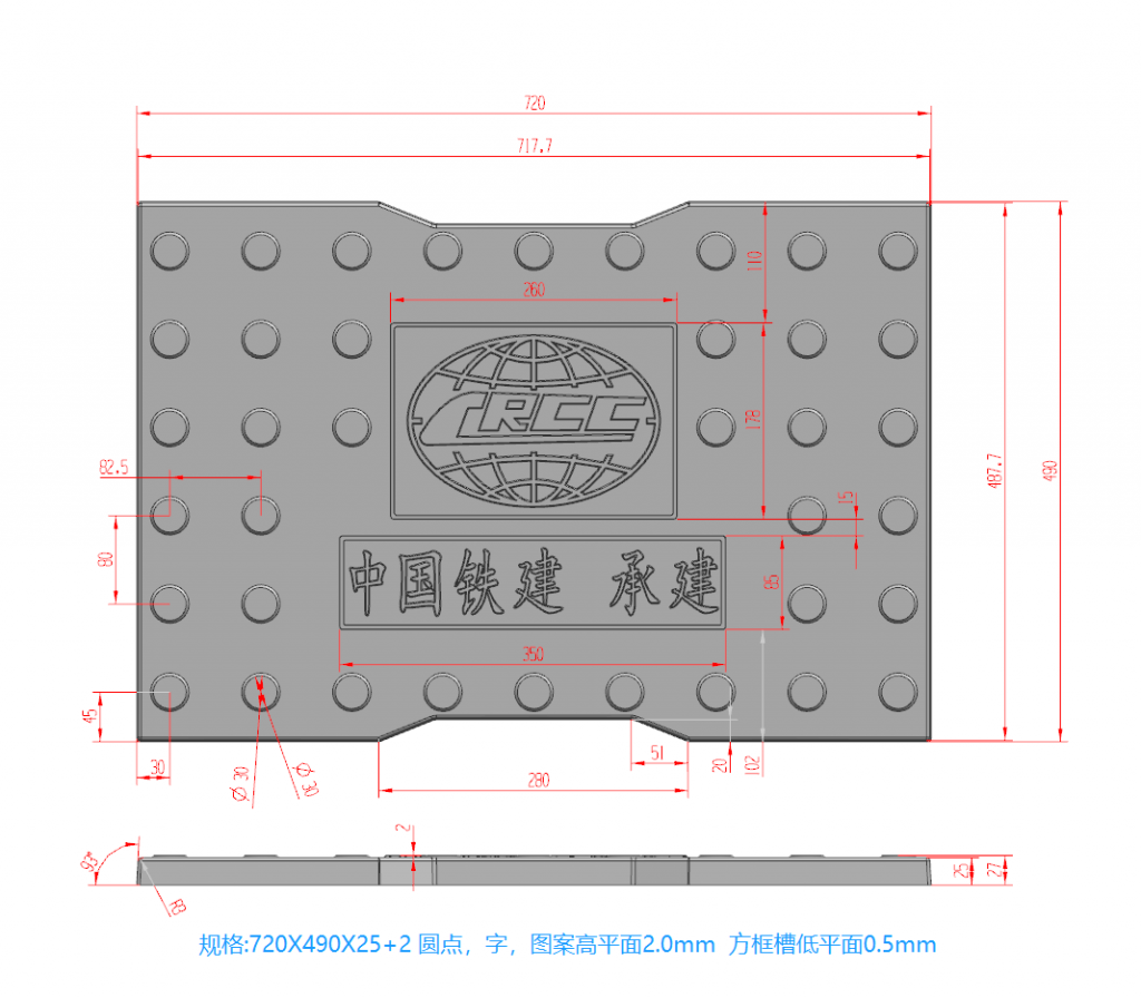 模具較薄,主要用于rpc材質(zhì)預(yù)制制作,花紋為缺口圓點,中間帶有中鐵圖標,底部設(shè)有中國鐵建 承建字樣,為中鐵專用模具。